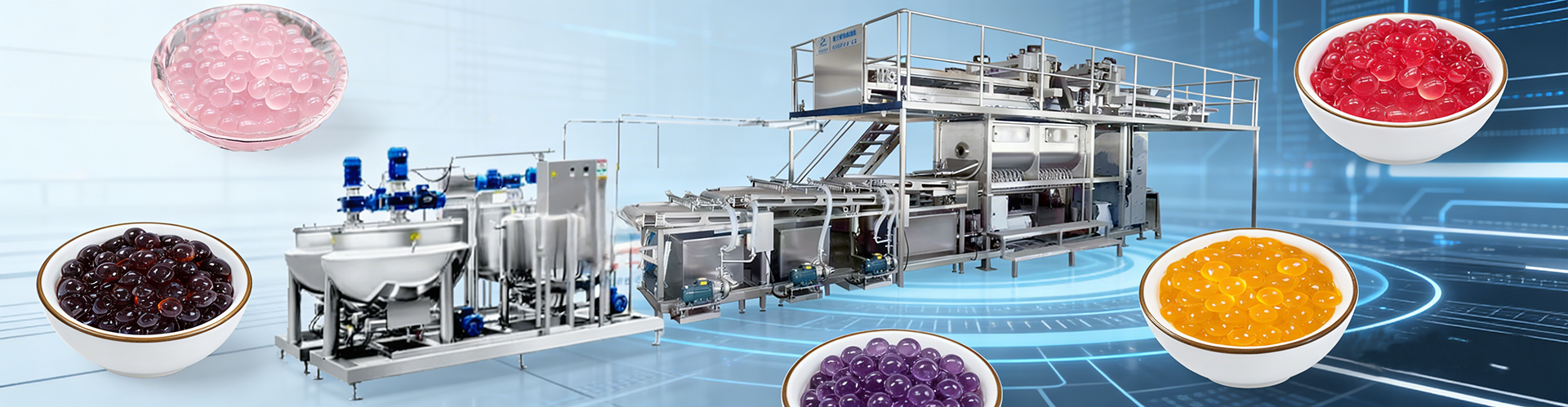 果汁爆珠小产量成型机:包含伺服果汁爆珠浇装、链条驱动托盘预成型、流槽、网带式固液分离和漂洗, 以及不锈钢框架,采用PLC控制和触摸屏操作,实现自动化连续高效生产。